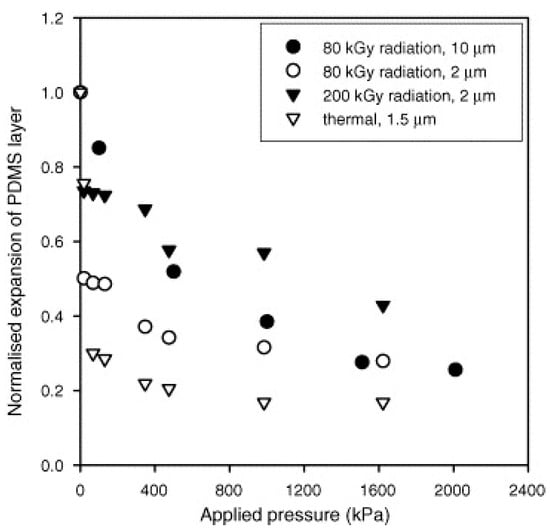 Tarleton et al. [35] assessed the swelling of four membranes, as reported in Figure 3, across the pressure range of 0–2000 kPa (Figure 4). All of the tested membranes showed a reduction in swelling with increased pressure. This reduction, attributed to membrane compaction, reduces the phenomenon, even though in different ways, dependent upon factors such as the starting thickness of PDMS and the degree of crosslinking.