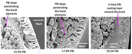 FESEM images of cross-lined braid-reinforced PBI hollow fibers with different dope concentrations. Reproduced from [48] with permission of Elsevier.
