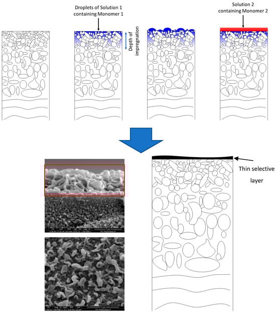 The IP process begins with the fabrication of the porous support, which will provide the mechanical stability of the TFC membrane, followed by the dispersion of two immiscible monomer phases, often referred to as the aqueous and organic phases. These monomers possess complementary reactive groups that can undergo a rapid and selective reaction when brought into contact at the interface, as shown in Figure 7. One of the significant advantages of IP is its ability to independently optimize the support layer to be mechanically robust and highly permeable, along with tailoring the selectivity and thickness of the top layer. The selective layer can be optimized by adjusting the reaction conditions, such as concentration and type of monomers, reaction time, and temperature, and by modifying the support layer. Common reactive groups of monomers include amines, phenols, and acid chlorides. A comprehensive review of the IP method and advancements in monomers is conducted by Li et al. [23].
