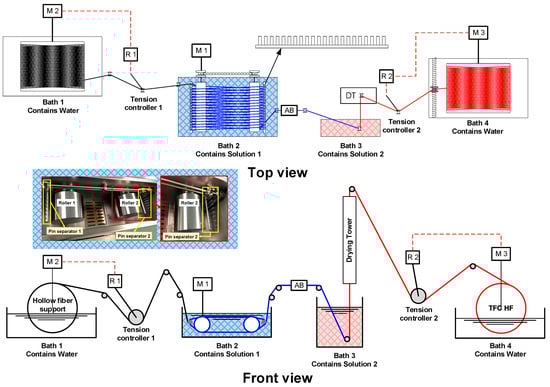 The IP process for fabricating the TFC HF membrane is described in Figure 8. First, the HF support is stored in a water bath (Bath 1). The porous support then contacts the 1st solution, which contains reactive monomer 1. Depending on the contacting time and the viscosity and surface tension of the solution, the penetration depth of the solution into the porous support can vary. It needs to be controlled well to manage the thickness of the selective layer. The saturation degree can be controlled by increasing or decreasing the immersion time of the support in the reactive solution 1. More specifically, the immersion time is controlled by adjusting the motor speed M1 and the number of loops in Bath 2. Depending on the speed of M1, the tension controller (R1) controls the motor speed of the support bobbin (M2). Removing the excess reactive solution from the membrane surface is one of the most challenging steps, and it can be achieved by an air blower (AB). At a fixed coating speed, adjusting the air flow rate and pressure can completely remove any excess. The saturated porous support with solution 1 then comes into contact with the 2nd solution, which contains reactive monomer 2. Then, the reaction between monomers 1 and 2 occurs at the pores’ openings, starting to form the selective layer. Herein, the reaction rate of the monomers is controlled by kinetics and then slowed down by diffusion [55]. The selective layer could hinder reactive monomer diffusion and inhibit further growth, namely the self-sealing process [56]. The resultant fibers pass through this drying tower (DT), where the solvent is dried, and the selective layer is thermally crosslinked. The drying tower consists of several heating guns and temperature sensors to monitor and control the drying temperature. Besides the heating gun, infrared (IR) and/or ultraviolet (UV) light can be employed. The tower length and the temperature profile can determine the drying speed. Finally, the TFC HF membrane is collected on the bobbin in Bath 4. The collecting speed is controlled by a second tension controller (R2) and bobbin-connected motor (M3).