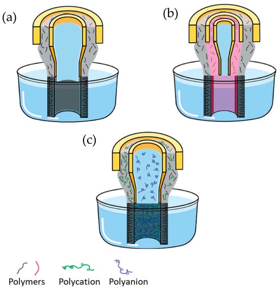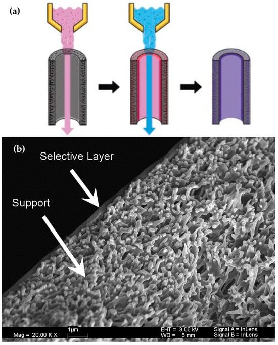 Dual layer HF membranes incorporate a similar benefit to those of TFC HF membranes. This involves utilizing a more economical polymer for the support layer to provide mechanical strength while using less of the more costly polymer for the selective layer. It is worth highlighting that dual layer HF membrane can also be referred to, in the literature, as the coextrusion of one polymer type using a triple spinneret with different fabrication parameters/conditions. This can solve one of the main limitations of dual layer HF membranes, which is the poor adhesion/delamination between two polymers or layers [73,74]. Sun et al. [57] fabricated a dual layer PI HF support utilizing less non-solvent to slow down the coagulation of the outer surface layer while the inner surface layer undergoes fast coagulation (i.e., forming highly porous morphology), followed by chemical crosslinking with 1,6-Hexanediamine (HDA) to enhance the chemical resistance of the membrane. Specifically, the addition of polyvinylpyrrolidone (PVP) to the outer dope solution was investigated for its ability to slow precipitation and, consequently, achieve a narrower pore size distribution suitable for the IP of the polyamide selective layer (methanol permeance of 0.9 L m−2 h−1 bar−1 and 99.3% rejection of Remazol brilliant blue, RBB) [57]. Similarly, HF OSN membranes can be fabricated in one step, combining precipitation and crosslinking steps simultaneously. This method, referred to as ‘‘Chemistry in a spinneret’’, follows the work of Kopeć et al. [75] and Dutczak et al. [76], aiming to optimize the fabrication steps of a crosslinked polyimide support (i.e., polyethylenimine (PEI) was used as a crosslinking agent). A novel crosslinked HF polyelectrolyte membrane was developed via combining ionic crosslinking between PEI and polystyrene sulfonate (PSS), covalent crosslinking using glutaraldehyde (GA), and phase inversion in the spinneret, as depicted in Figure 9c [77]. Additionally, Sun et al. [78] applied the same concept by combining crosslinking with phase inversion using a PBI dope solution as the outer surface layer (selective layer) and feeding a polyimide dope solution to the inner surface, due to its imide groups, to be further crosslinked with PEI. The optimal membranes showed more than 99% rejection toward methylene blue (MB) in methanol and acetonitrile [78].