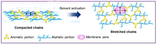 The extent of swelling depends on the type of selective/support layer, activation duration, and the solubility parameters of the solvents (i.e., solvency power). Studies have revealed that solvent-induced changes in the performance of polyamide-based TFC membranes can be predicted using Hansen solubility parameters [108,109]. For example, the crosslinked PI HF support membranes (reported by Wang’s group in the previous paragraph) were fabricated to be thinner to increase the packaging density of the fibers, and the spinning parameters were optimized to obtain a tighter selective layer. This enhanced the selectivity of the resultant TFC HF membranes and hence lowered the permeance. The MPD-based TFC membranes were activated with DMF to increase the acetone permeance by almost 5-fold to 24.3 L m−2 h−1 bar−1 while maintaining its solute rejection (MWCO of 269 g mol−1 in acetone). This can be attributed to the swelling of weaker molecular chains of the polyamide layer and the crosslinked PI support layer due to similar solubility parameters with DMF. The aliphatic part of the polyamide layer tends to stretch, enabling the entry of DMF into the membrane matrix, while the aromatic part of the crosslinked network prevents it from dissolving, as represented in Figure 12 [59,110]. Therefore, semi-aromatic polyamide structures containing aromatic rings and hexagonal structures showed minimal change with solvent activation [88,110].