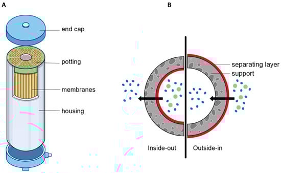 (A) Schematic representation of a hollow fiber module. (B) Inside-out vs. outside-in filtration. Reproduced from [27] with permission of Elsevier.