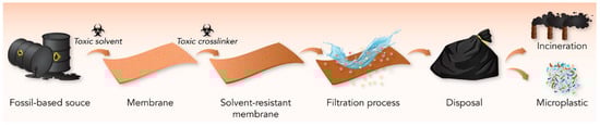 Despite the widespread application of OSN technology, most commercially available OSN membranes are currently manufactured from fossil-based polymers, such as polybenzimidazole, polysulfone, and polyamide using environmentally harmful solvents. Nanofiltration membranes fabricated from these conventional polymers undergo a linear lifecycle (Figure 14), necessitating disposal in a landfill or environmental setting (approximately 79% of polymers) or incineration (approximately 12% of polymers) at the end of their lifecycle, which in turn leads to substantial carbon dioxide emissions [121].