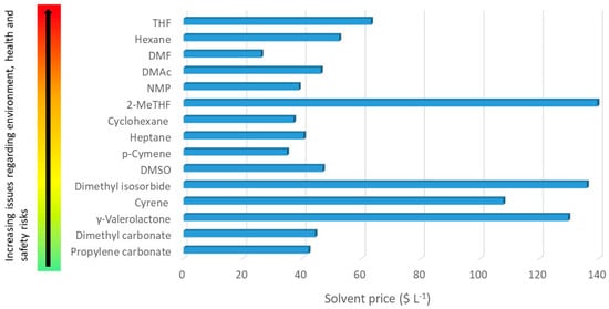 Price of common organic solvents (in USD per liter, 2023) used for the fabrication of OSN membranes. The prices were based on purity of ≥99% (i.e., ReagentPlus and extra pure grades, according to the manufacturer). The prices were obtained from the databases of Sigma Aldrich (St. Louis, MO, USA) and Thermo Fisher Scientific (Waltham, MA, USA) (accessed on 15 December 2023). On the left panel, solvents were classified based on GlaxoSmithKline (GSK) (Tokyo, Japan) solvent sustainability guide [143].