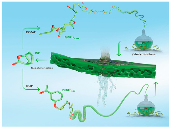 Recycling stands out as a promising sustainable option compared to other methods, including landfill use and incineration. The European Union (EU) has set ambitious goals to ensure that by the year 2040, all plastic packaging is either completely recyclable or recoverable [158]. Transforming waste materials into valuable resources will help to reduce the environmental footprint across various industries. An illustrative example of this is the work conducted by Nunes’s group on recycling used hydrophobic polyethylene terephthalate (PET) plastic bottles into porous supports fabricated via NIPS for OSN [159]. The recycled PET supports can be effectively utilized in the IP process to develop TFC OSN with thin selective layers (~30 nm) [136,139]. It is noteworthy that many sustainable polymers discussed in academic research have not undergone a comprehensive lifecycle assessment. Such an assessment is essential to quantify their environmental impact and draw comparisons with existing fossil-fuel-based polymers. For example, specific polymers that are derived from fossil fuels, such as polycaprolactone (PCL) and polybutylene adipate terephthalate (PBAT), have biodegradable properties. On the other hand, some polymers derived from natural resources (sugarcane and corn), such as bio-based polyethylene (bio-PE) and bio-polycarbonate (bio-PC), are not biodegradable [160]. In a recent study, Hardian et al. [161] fabricated freestanding recyclable nanofiltration membranes from novel polyester P (BIL)ROP and poly(cyclic olefin) P(BIL)ROMP polymers using γ-butyrolactone as the green solvent (Figure 16). Noteworthy, both polymers can be obtained from a single hybrid bicyclic lactone-olefin (BIL) monomer, a hybridization of γ-butyrolactone and cyclohexene constituents. Both γ-butyrolactone and cyclohexene can be derived from natural products and biologically synthesized, classifying them as renewable sources [161].