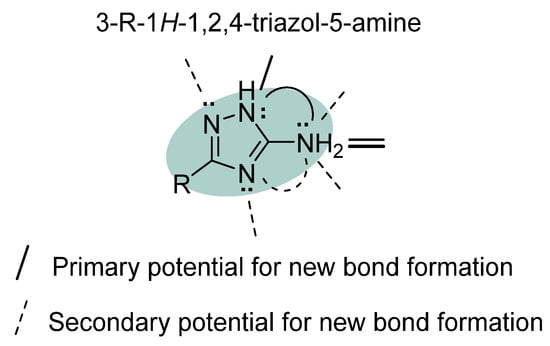 Schematic reactivity profile of 5-R-3-amino-1,2,4-triazoles (3-R-1H-1,2,4-triazol-5-amine) towards electrophiles: The potential formation of novel bonds as a result of reaction is shown for major (with solid lines) and for minor or unusual (with dashed lines) reaction directions. Their ability to form Schiff bases upon reaction with aldehydes and their synthetic equivalents is presented with a bold double bond [20].