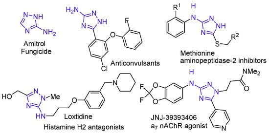Moreover, numerous studies have described substituted 3-amino-1,2,4-triazoles (Figure 2) as exhibiting various biological activities [21,22,23,24,25]. Amitrol is a non-selective systemic herbicide broadly used for weed control in agriculture. The EPA revoked approval for Amitrol’s use in food products due to its carcinogenic effects observed in animal studies. Due to its high solubility in water, it can cause contamination of drinking water, resulting in leakage and contamination of groundwater and surface water, which can lead to contamination of drinking water and agricultural foods. The World Health Organization has determined the maximum limit of amitrol in drinking water to be 1 μgL−1 [21]. The related compound has potent anticonvulsant activity [ED50 = 1.4 (1.0–2.2) mg/Kg] compared to diazepam (Sigma) [ED50 = 1.2 (0.5–1.9) mg/Kg] [22]. Related triazoles showed dose-dependent activity in the aortic ring tissue model of angiogenesis, highlighting the potential benefit of methionine aminopeptidase-2 (MetAP2) inhibitors as anticancer agents [23]. Loxtidine, a selectively acting histamine H2-antagonist, causes a much longer-lasting inhibition of gastric acid secretion in rats and dogs. Both the insurmountable blockade and the long duration of action are due to the prolonged but gradually reversible occupation of the affected receptors [24]. JNJ-39393406 was suggested for add-on therapy to antipsychotics. This positive allosteric modulator of the α7 receptor shows promising potential as a treatment for schizophrenia, as demonstrated in the Phase I trials and a proof-of-mechanism study. However, while it demonstrates favorable safety and pharmacokinetic profiles, its efficacy in addressing the core deficits of schizophrenia warrants further investigation in larger clinical trials [25].