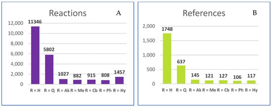 Reaction search results, where 3-R-1H-1,2,4-triazol-5-amine (see Figure 1 for its structure) was used as a starting reactant (A) and the numbers of literature courses, where these reactions are described (B). Here, the designations of the variable substituents are used as in the search engine: Q—any atom except C or H, Ak—any carbon chain, Cb—any carbon cycle, Hy—any heterocycle. Data according to CAS SciFindern [31], as of 11.01.2024.