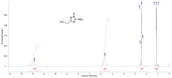 3-Amino-5-ethyl-1,2,4-triazole (4a): Previously described [45]. Yield 86% (87% for the scale-up procedure), mp 132–134 °C. IR (ATR), ν (cm−1): 3425, 3329, 3232, 2978, 2939, 2831, 2792, 2719, 2654, 1627, 1581, 1543, 1462, 1427, 1392, 1292, 1064, 968, 840, 802. 1H NMR spectrum, δ, ppm: 1.14 t (J = 7.5 Hz, 3H, CH3), 2.44 q (J = 8.3 Hz, 2H, CH2), 5.66 br. (2H, NH2), 11.86 br. (1H, NH) (Figure 4). 13C NMR spectrum, δ, ppm: 12.28 (CH3), 20.70 (CH2), 153.41 (C-3 of triazole), 161.18 (C-5 of triazole). Found (%): C 42.72, H 7.18, N 49.84; C4H8N4. Calculated (%): C 42.84, H 7.14, N 49.96.