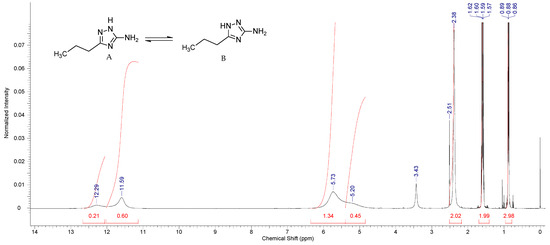 3-Amino-5-propyl-1,2,4-triazole (4b): Previously described [40]. Yield 83%, mp 142–145 °C. IR (ATR), ν (cm−1): 3410, 3321, 3213, 2958, 2931, 2870, 2839, 2781, 2650, 1620, 1546, 1481, 1462, 1404, 1342, 1265, 1080, 1056, 1033, 898, 759. 1H NMR spectrum, δ, ppm: 0.88 t (J = 7.5 Hz, 3H, CH3, A and B), 1.59 m (2H, CH2, A and B), 2.38 br. (2H, CH2, A), 3.48 br. (2H, CH2, B), 5.20 (2H, NH2, B) and 5.73 br. (2H, NH2, A), 11.59 br. (1H, NH, A) and 12.29 br. (1H, NH, B) Two tautomers exist in the ratio A:B = 3:1, see (Figure 5). 13C NMR spectrum, δ, ppm: 13.66 (CH3), 20.86 (CH2), 34.60 (CH2), 162.45 (C-3 of triazole), 164.52 (C-5 of triazole). Found (%): C 47.54, H 7.88, N 45.04; C5H10N4. Calculated (%): C 47.60, H 7.99, N 44.41.