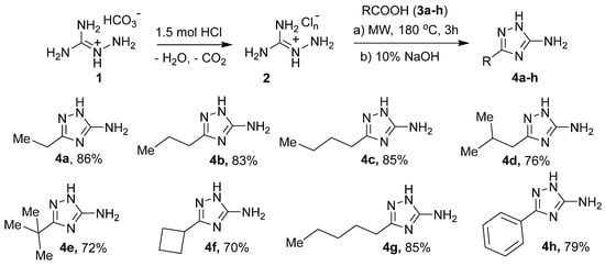 Synthesis of compounds 4a–h (General method for a small scale synthesis): A mixture of 1.36 g (0.01 mol) of aminoguanidine hydrocarbonate (compound 1), 1.25 mL (0.015 mol) of a 37% solution of HCl, was mixed under agitation for 1 h, water was evaporated, and thus 1.3 g dry solid (compound 2) was collected and mixed with organic acid 3 (0.012 mol) in a G10 microwave process vial. The mixture was irradiated at 180 °C for 3 h in the monomode Anton Paar Monowave 300 microwave reactor. The resulting melt was cooled and neutralized with 10% water solution of NaOH to achieve pH 8, and the solvent was evaporated in vacuum and crystalized from 5 mL of ethyl acetate. Compounds 4a–h were obtained in the form of white solids and further characterized without additional purification. 5-Subsituted 1,2,4-triazoles (4a–g) were synthesized without the use of the solvent, with the exception of 4h where i-PrOH was used as solvent since benzoic acid (3h) is solid.