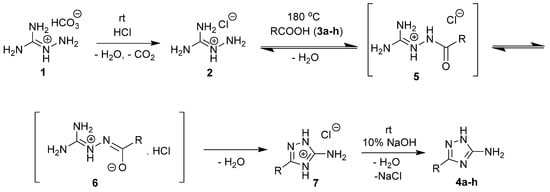 Previous studies have shown that the crucial stage in the synthesis of 3-substituted 5-amino-1,2,4-triazoles from aminoguanidine and carboxylic acids is the one in which guanyl hydrazides are formed. Due to the fact that the guanyl hydrazide (5) formation step is acid-catalyzed and reversible, its success is highly dependent on the reaction conditions. In this regard, the following points are important: (i) reaction medium pH ≤ 1, (ii) to ensure rapid equilibrium attainment (it is necessary to use a concentrated solution with minimal water content), (iii) the application of an optimized excess of HCl acid as also shown previously [43,51].