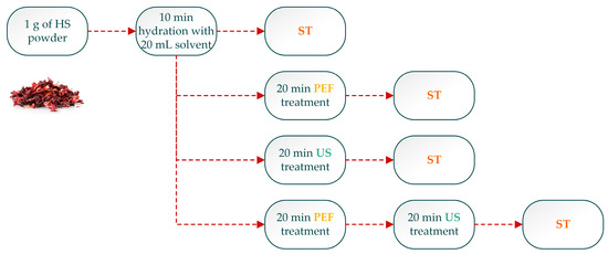 The extraction process of HS (Hibiscus sabdariffa) dry flowers using different techniques (ST: stirring, PEF: pulsed electric field, US: ultrasound).