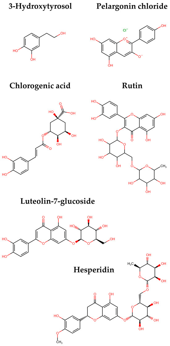 Pelargonin emerged as the principal polyphenolic compound within the optimal extract, as presented in Table 6, comprising approximately 87.80% of the total polyphenolic compounds. Pelargonin is classified as an anthocyanin, commonly present in red fruits and vegetables, functioning as a natural colorant [53]. Identified mainly in dates, pelargonin has been investigated for its anti-allergic properties [54]. Moreover, it is reported to exhibit oxygen radical absorbance capacity [55]. Pelargonin chloride has been previously identified in HS flowers from a variety in Mexico in minimal quantities. More specifically, it was found in amounts of 0.00217 mg/g dw [56], which is much lower than what can be obtained by applying ideal extraction procedures. According to previous studies, the leaves of HS are rich in chlorogenic acid [57], known for their pharmacological activities, encompassing anticancer, antidiabetic, antiviral, and antipyretic properties [58,59]. Besides the leaves of the HS, it is evident (Table 6) that the flowers also contain a considerable amount of chlorogenic acid. Additionally, it is apparent that hesperidin is present in the flowers, which has neuroprotective effects observed across various models of central nervous system disorders [60]. In a preceding investigation, the calyces of HS exhibited a hesperidin content of 0.14 mg/g dw, resulting in a 600% reduced content compared to the optimal extract of HS presented herein. This means that the enriched extract, besides excelling in polyphenolic compounds, may also possess all the beneficial properties of these compounds. Figure 5 shows the chemical structures of the polyphenolic compounds that were identified in the extracts of HS.