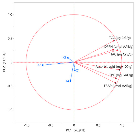 Principal component analysis (PCA) for the measured variables. Each X variable is presented with a blue color.
