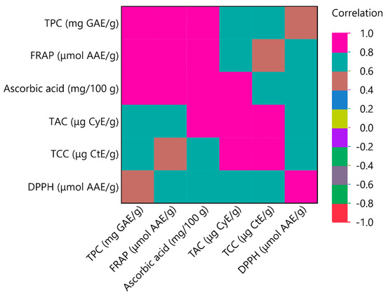 In Figure 7 and Figure 8, the correlation of values among various bioactive compounds is depicted, revealing noteworthy outcomes. In Figure 7 it can be seen that component 1 explained 76.9% of the variability, presenting a positive correlation with all of the examined variables TPC, TAC, FRAP, DPPH, TCC, and AAC. Furthermore, it is discernible that among the extraction factors, the one that predominantly influences the increase in various bioactive compounds is X2. It is extensively noted that ethanol plays a significant role in enhancing the isolation of bioactive compounds. Regarding Figure 8, it is worth noting that in numerous studies, the correlation among variables is often low or even negative. However, in the current research, not only a negative correlation is not observed, but the lowest correlation is 0.6, with a maximum value of 1, and this is observed in only one variable, that of antioxidant capacity through the scavenging of free radicals. Most bioactive substances exhibit a maximum correlation coefficient of 1. Specifically, the variables TPC, FRAP, and AAC recorded the highest correlation, demonstrating that both TP and AA exhibit strong antioxidant activity. Additionally, a robust correlation was observed between the TAC variable and both AAC and TCC. These results are highly encouraging, as it is rare to observe such a high degree of correlation in multivariate systems with multiple sensitive variables.
