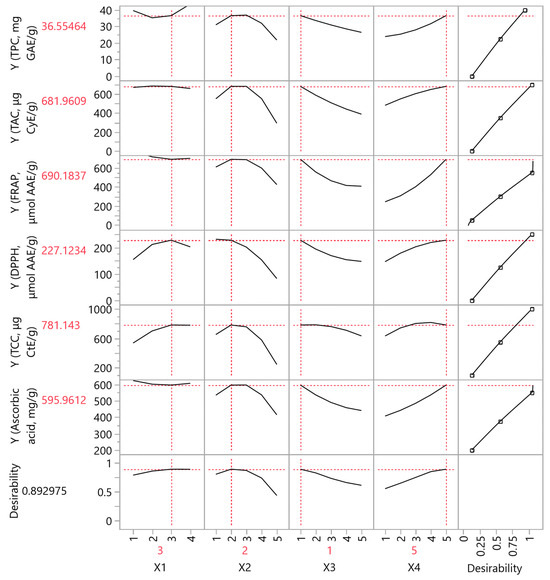Highest desirability for all variables using the partial least squares (PLS) prediction profiler under the optimal extraction conditions (X1:3, X2:2, X3:1, X4:5).