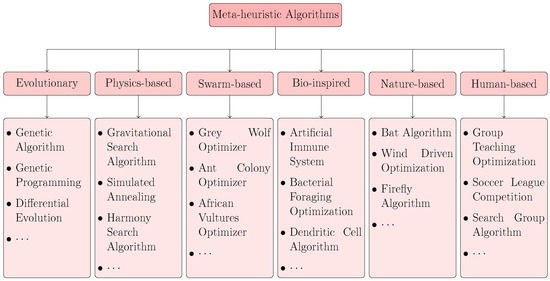 Optimization, which is the methodological search for variable sets to minimize error in problem solving, is important in many different engineering domains [5]. The most used optimization method in recent years has been Metaheuristic (MH) algorithms. Although they do not provide exact solutions, MH algorithms demonstrate the capacity to quickly find near-optimal solutions [6]. While some other MH algorithms have been published in the literature, swarm-based techniques have seen significant advancement in the field of MH algorithms. Figure 1 categorizes well-known MH algorithms.