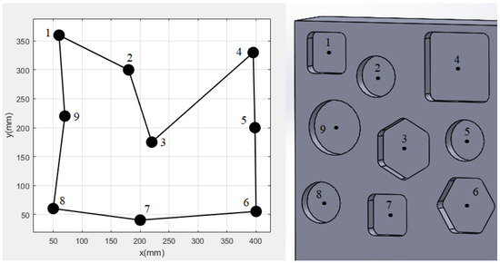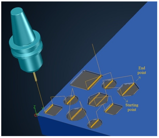 In the case of the tool path not being optimized, it leads to an increase in the milling process time and, consequently, manufacturing costs. To address this issue, the starting and ending points of pocket milling processes were considered instead of the center points. An illustration of non-optimal path planning for pocket milling is provided in Figure 2. The algorithms were implemented to differently shaped pockets such as circle, triangle and hexagon, as shown in Figure 2. The numbers represent the order of the pockets in the non-optimal path. Additionally, Figure 3 depicts a selected pocket and the corresponding tool path generated, taking into account the starting and ending points, particularly in the context of zigzag-type milling.