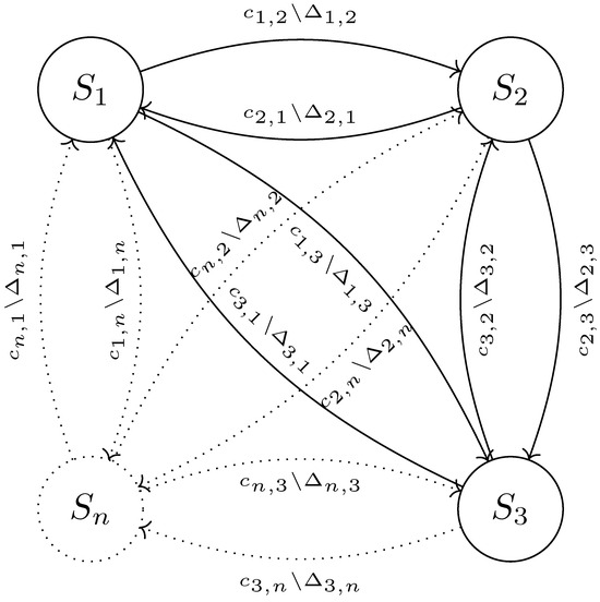 Model of the DCS method (while the solid lines show the transitions between states that appear in the figure, the transition from any state to another state for a system with n-states is shown with dotted lines).
