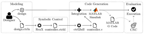Our workflow of the implementation process of SDCS is as shown in Figure 5. As depicted in the block diagram of the system architecture, it consists of four main parts. In the modeling phase, an uncontrolled design is modeled both in the platform to be implemented and in our symbolic model presented in the ReaX environment with the desired system behaviors by a designer. Subsequently, with our safety and optimization algorithms, symbolic control is achieved, resulting in a controller. In the code generation section, this generated controller is transferred to the MATLAB environment with a Verilog or C extension file. Then, simulation can be performed in the MATLAB environment, or MATLAB G code can be obtained and transferred to a physical system, namely a CNC, to execute the desired system behaviors.