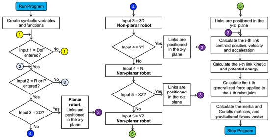 The first option provides access to a library that includes dynamic models of some well-known robots, including PUMA, Stanford, SCARA (Selective Compliance Articulated Robot Arm), and planar manipulator robots. The second option allows for obtaining the dynamic model of a new robot type created by the user, who should specify the number of degrees of freedom, the type of configuration, and the workspace. These three statements (five maximum) are entered into the command window of MATLAB once the software is executed and requests the input. Specifically, to indicate the robot’s DoF (input 1), a number must be entered at the command line; to set up the type of robot (input 2), the characters R and/or P should be typed, as they denote rotational and prismatic joints, respectively; while for the workspace (input 3), the initial location of each link in space should be indicated through the statement 2D or 3D. If the input is 2D, the software computes the complete robot dynamics and confirms that it is a planar prototype that starts to operate from the x−y plane with its links resting on the positive semi-axis x, whereas if the input is 3D, the software confirms that the robot is non-planar and immediately requests additional information (inputs 4 and 5) to define the initial position of each link. For example, for a 2-DoF non-planar robot, if the first combination of inputs is 3D and Y (input 4), then the first link is positioned in the x−y plane, whereas if the second combination of inputs is 3D and N, the second link is positioned in the x−z or y−z plane depending on what the user specifies (input 5). The general description and organization of the GUI is illustrated in Figure 4.
