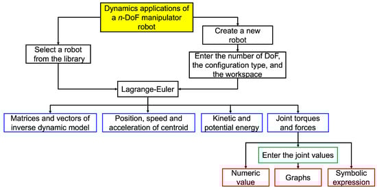 In future research work, it is contemplated to build other relevant mathematical models—for example, direct and inverse kinematics models—by taking advantage of the ideas of this study. In addition, it is desired to expand the gallery of robots available in the software library, possibly by incorporating mobile, flexible, and spatial robots. The large amount of information requested by the program before displaying the dynamic models is an aspect that is also being considered for the future. Addressing the latter would improve the efficiency of this work by ensuring that the interaction between the software and user is minimal and that any person in general is able to manipulate this type of program.