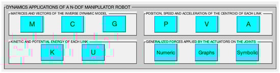Figure 5 shows a sub-window of the GUI, which displays the applications of the robot dynamics that can be accessed. These include the elements of the mass matrix (M); the elements of the damping, Coriolis, and centripetal forces matrix (C); the components of the gravity forces vector (G), positions (P), velocities (V), and accelerations (A) of the center of gravity (centroid); and the kinetic energies (K) and potential energies (U) of the robot links. Additionally, the toolbox allows for the monitoring of the generalized forces acting on each manipulator robot joint in a numerical, graphic, or symbolic form. For example, with the ‘Symbolic’ icon, the symbolic equations of the torques and forces are displayed in a GUI static text box. To improve readability, these expressions can be shown in code or plain-text format.