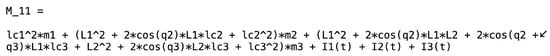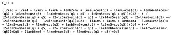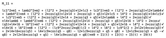 To better illustrate the qualities of the software, robots with 3-DoF, 6-DoF, and 9-DoF are presented in Section 2. In the particular case of the 6-DoF manipulator robot, its mass and Coriolis–centripetal forces matrices are composed of 36 elements, while the gravity forces vector has six components. By clicking on the corresponding icon on the menu in Figure 5, any matrix or vector forming the inverse dynamic model can be obtained along with other applications. Figure 6, Figure 7 and Figure 8 show some of the equations that the software generates as code.