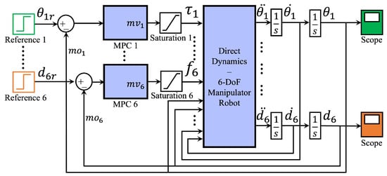 Simulation diagram of the MPC-based controllers for a 6-DoF manipulator robot.