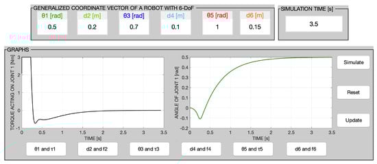 To validate the dynamic model, the manual calculations (Equations (8) and (A40)) are compared with the results of this software (Figure 6, Figure 7 and Figure 8). It is confirmed that the program completely solves the problem of direct and inverse dynamics of manipulator robots. A proof of the model matching in the case of the 6-DoF manipulator robot is shown in Figure 9.