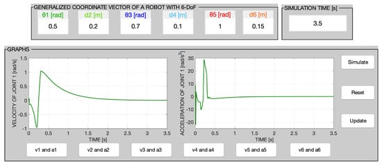 To monitor the instant numerical values or the graphics of the control signal, the icons ‘Numeric’ and ‘Graphs’, respectively, in Figure 5 are selected. Specifically, for a view of the control signal graphics, the value of each joint needs to have been previously entered in the editable box. In general, by clicking the icons ‘Simulate’ and ‘ and ’ (or ‘d and f’) in Figure 11,the graphs of the generalized forces and motion of the 6-DoF redundant manipulator robot joints can be seen. Additionally, graphs of the velocities and accelerations of the robot joints can be displayed by pushing the ‘Simulate’ and ‘v and a’ buttons, as shown in Figure 12.