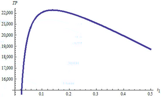 The empirical results, demonstrated by the proposed algorithm, calculate as follows: optimal maintenance checks 1; an optimal production cycle length of = 0.1675 months; an optimal replenishment cycle length of T* = 0.5384 months; an optimal time interval between each maintenance check of = 0.0873 months; the total carbon emissions per month is 5030.6 kg; and the total profit per month is TWD 22,886. The entire solution process and optimal solution values are shown in Table 3. By comparing the scenario without maintenance (n = 0), it can be found that proper equipment maintenance not only contributes to the low-carbonization of manufacturing but can also effectively increase the total profit compared with no equipment maintenance. Furthermore, Figure 2 presents a graphical illustration of the total profit with respect to for n = 1, and Figure 3 displays an illustration of the optimal total profit versus n, which implies the concavity of the proposed model can be verified.