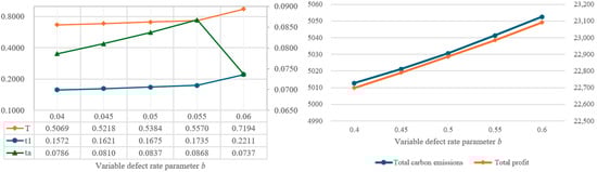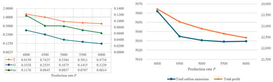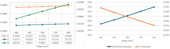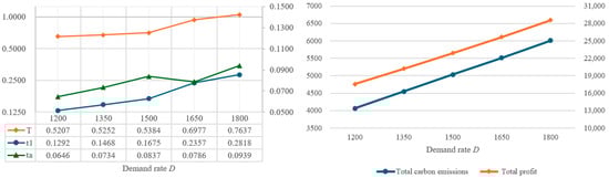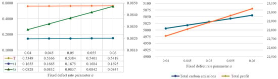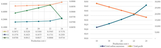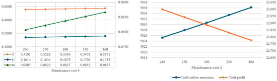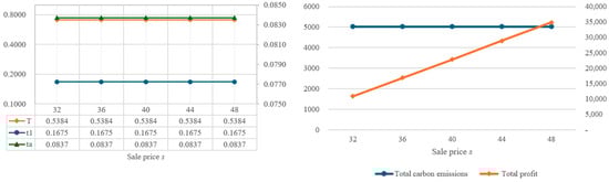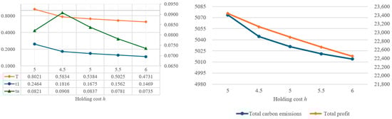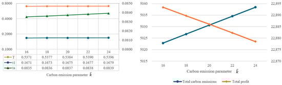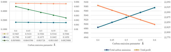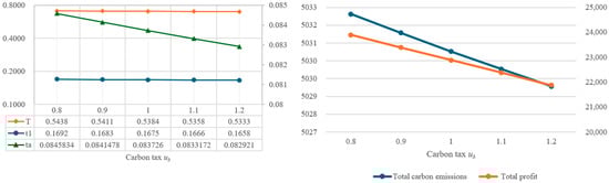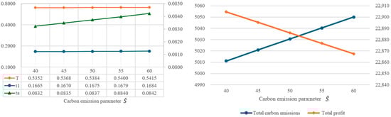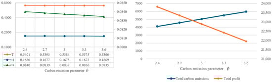 In order to understand the impact of parameter changes on the optimal solutions, this study intends to conduct a sensitivity analysis of the parameters of the proposed model. By using the same values as the example in Table 2, the individual parameters are increased or decreased by 10% or 20%, while other parameters remain unchanged. Based on the changes in various parameters, the impact on the optimal decision variables, total amount of carbon emissions, and total profit are illustrated in Figure 4, Figure 5, Figure 6, Figure 7, Figure 8, Figure 9, Figure 10, Figure 11, Figure 12, Figure 13, Figure 14, Figure 15, Figure 16 and Figure 17 and also tabulated in Table 4.