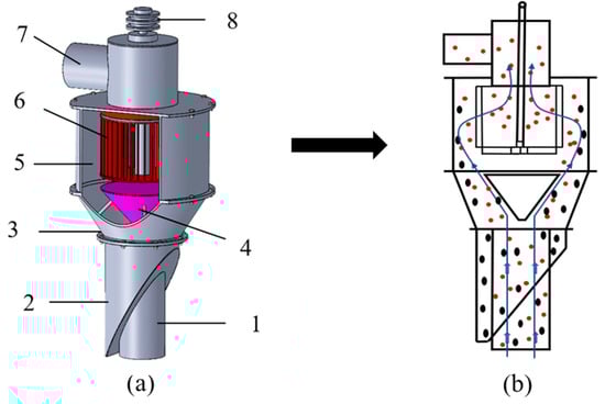 Three-dimensional structure view (a) and working principle (b) of the rotor classifier: 1—air and material inlet, 2—coarse powder outlet, 3—cone area, 4—guide cone, 5—classifying chamber, 6—rotor cage, 7—air and fine powder outlet, 8—transmission shaft.