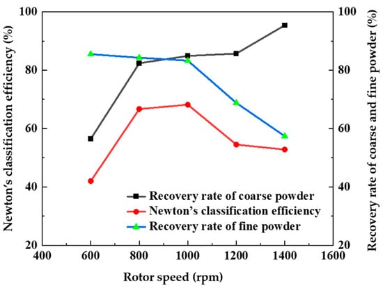 Newton’s classification efficiency and recovery rate of the coarse and fine powder of different rotor speed.