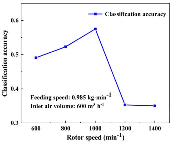 To investigate the impact of the rotor speed on the classification performance, five sets of experiments with different rotor speeds (600 rpm, 800 rpm, 1000 rpm, 1200 rpm, and 1400 rpm) were designed. The feeding speed was kept constant at 0.985 kg·min−1 and the inlet air volume was kept constant at 600 m3·h−1.
