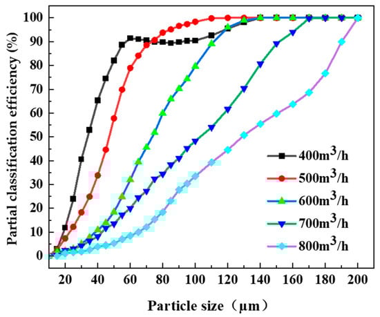 In order to study the impact of the inlet air volume on the performance of the classifier, five sets of experiments with different inlet air volumes (400 m3·h−1, 500 m3·h−1, 600 m3·h−1, 700 m3·h−1, and 800 m3·h−1) were designed. The feeding speed was kept constant at 0.985 kg·min−1, and the rotor speed was kept constant at 1000 rpm.