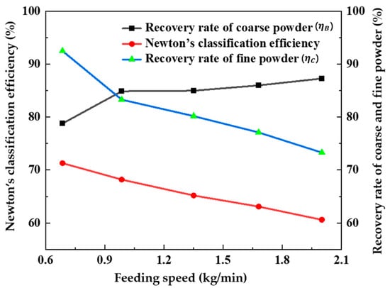 Newton’s classification efficiency and recovery rate of the coarse and fine powder of different feeding speeds.