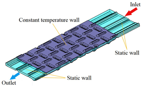 The heat transfer process of a heat exchanger is an intricate physical process. The coolant is exchanged by heat flow. Therefore, CFD is used in this paper to solve the physical field of heat exchange. To save calculation time, the three-dimensional single-channel model of a capsule-type plate is shown in Figure 2. The surface of the plate is a pressed capsule structure. The wall around the inlet outlet is set as the static wall. The flow velocity is 0.8m/s and the temperature is 363 K. The capsule-type plate is set as the constant temperature wall surface and the temperature is 318 K.