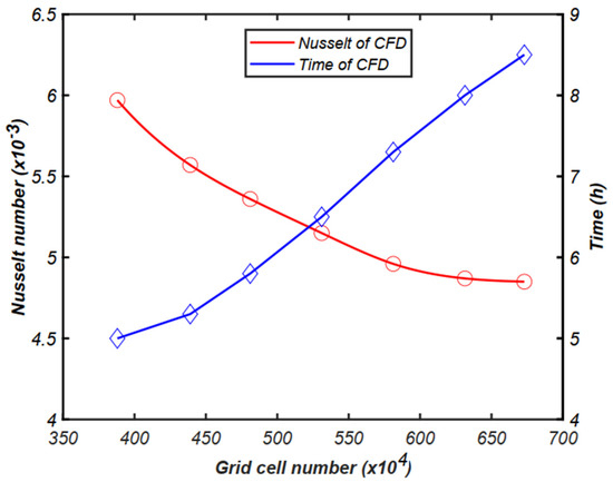 In order to give consideration to both simulation accuracy and calculation time, the solution domain is divided by Anasys mesh, and tetrahedral mesh was selected. In the grid independence verification, the computation time and results of seven different grid partitioning schemes are compared. The number of meshes of the seven schemes are 3.87 million, 4.39 million, 4.81 million, 5.32 million, 5.81 million, 6.36 million and 6.77 million. The simulation results are evaluated using Nusselt number. According to Nusselt number and calculation time, the optimal number of grids is evaluated comprehensively. As shown in Figure 3, as the number of grids increases, the calculation time is significantly prolonged, and the change in Nusselt number also tends to be stable. Therefore, 6.36 million grid units can meet the accuracy and time of calculation, as shown in Figure 4.