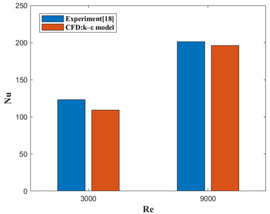 In order to verify the credibility of the simulation results, the model is built according to the structural parameters in [22]. The data obtained through CFD calculation are compared with the results in the literature, as shown in Figure 5. Under the condition of RE = 3000 and RE = 9000, the Nu values of fluid simulation results and test results are compared. With the increase in turbulence, the variation trend of simulation and test is constant and Nu number increases. The coincidence between experimental and simulation data is higher than 90%. This comparison can confirm the accuracy of the simulation method and provide a credible basis for the follow-up research.