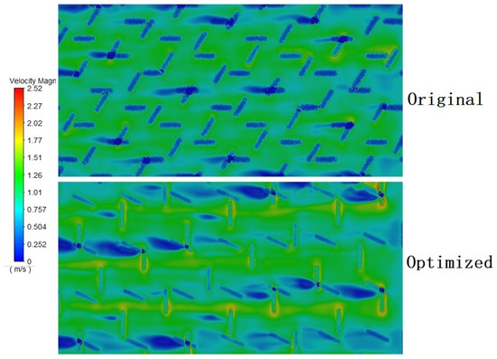 Figure 7, Figure 8 and Figure 9 show the flow field changes before and after capsule-type plate optimization. Figure 7 is the speed comparison diagram. The scattered capsule protrusions affect the fluid flow. As can be seen from the figure, a low-speed zone appears on the back flow surface of the capsule. At the same time, the phenomenon of flow around the region is generated and the fluid is turbulent.