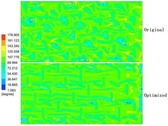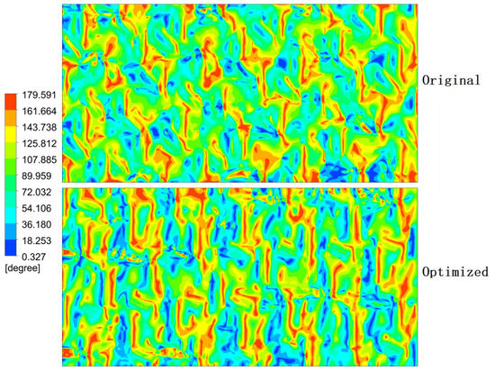 The comparison of the synergy angle θ is shown in Figure 12. It shows the ratio between velocity vector and pressure gradient of the flow field at the same position of the flow passage. It can be seen from the figure that synergy angle θ has similar characteristics before and after optimization, with higher values appearing in the bulge, because the bulge blocking causes the flow velocity to be opposite to the pressure direction. A higher synergy angle θ, on the other hand, indicates a higher inlet pressure for the fluid. Compared with the θ values before and after optimization, the optimized structure is smaller, which is beneficial to improve the heat transfer efficiency of the flow passage.