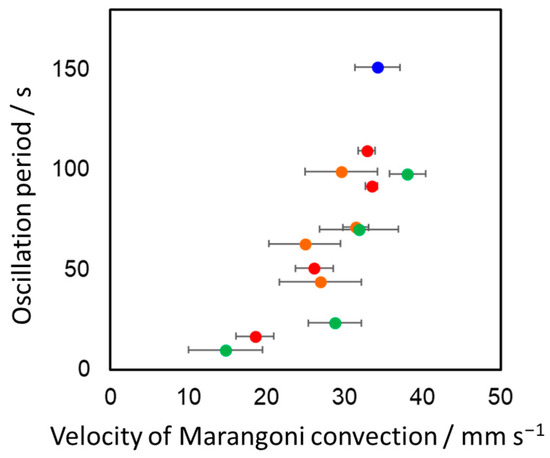 - Onoda, K.; Nanzai, B. Periodic expansion and contraction phenomena in a pendant droplet associated with Marangoni effect. Materials 2022, 15, 239. [Google Scholar] [CrossRef]