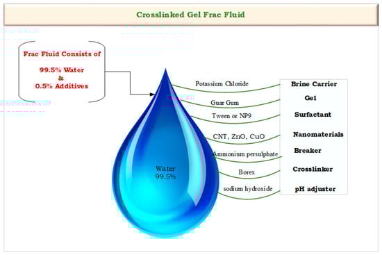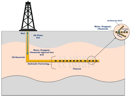 Hydraulic fracturing, or “fracking”, has emerged as an indispensable methodology in the oil and gas industry, revolutionizing energy production and playing a pivotal role in global energy supply. Fracking has drawn the attention of numerous researchers and technicians in the oil and gas industry due to its advancements in enhancing the production of oil and gas wells; increasing low-permeability reservoir production, such as from shale; providing economic benefits by improving the security of energy; reducing dependency on oil and gas imports; and being utilized in gas production as a cleaner source of energy than coal to reduce global greenhouse gas emissions [,,]. The fracking process involves the high-pressure injection of frac fluid into underground rock formations, aiming to create fractures within oil/gas reservoirs, which enhances the production to the surface, as demonstrated in Figure 1. Therefore, a specific viscosity of the frac fluid is required to carry the proppant particles into the fractured locations [,].