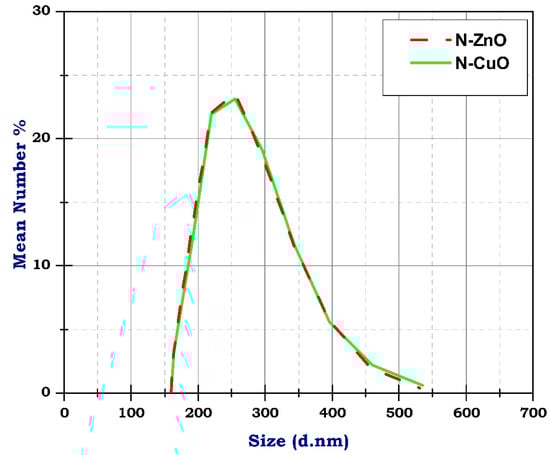 Figure 5 represents the DLS of N-ZnO and N-CuO particles. DLS analysis is employed to quantify the nanomaterial particle size depending on the z average, intensity, and particle numbers indicating the poly disparity index (PDX). The PDX is mostly less than 0.6 (Ref). Accordingly, the CNT particle distribution is very narrow, with a PDX equal to 0.4, and the CNT diameter ranges between 10 nm and 500 nm, resulting from TEM analysis. Similarly, N-ZnO and N-CuO particle distribution is very narrow, with a PDX of 0.3 and 0.4, both less than 0.6, respectively. The z average is approximately 300 nm for N-ZnO and N-CuO, as shown in Figure 5. Table 3 shows the size, mean number, and standard division of DLS analysis of CuO and ZnO nanoparticles. The analysis of nanoparticles using DLS reveals that the average size is around 50 nm, with a deviation of 5 nm. Based on the sample, there are 100 particles on average, indicating a relatively low particle count. Conversely, when analyzing ZnO nanoparticles using DLS, we found a size range of 30–200 nm and an average particle count of 100, with a deviation of 10 nm. The number of nanoparticles for both CuO and ZnO is relatively high, suggesting the presence of particles in the samples. The narrow standard deviation values further support these findings from the PDX analysis, indicating a distribution of particles in both cases.