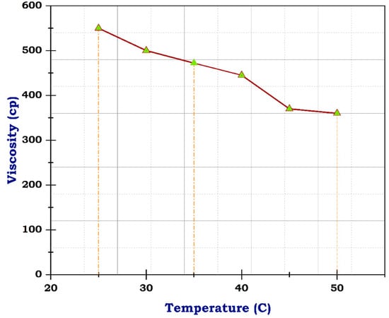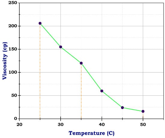 The study of the deformation and flow behavior of various materials is known as rheology, while rheometer refers to the experimental techniques and tools used to determine rheological properties. Viscosity can be determined by measuring the resistance of a sample as it is sheared. Emphasizing the rheological properties of the frac fluid sample is essential in determining the behavior and suitability for various applications. It has been observed that the viscosity of the sample decreases with an increase in temperature, indicating the significant influence of temperature on its rheological properties. Therefore, it is crucial to carefully consider and control the temperature conditions during the testing and application of the sample to ensure optimal performance and desired outcomes []. Rheological experiments were conducted using the Anton Paar MCR 502 rheometer, Montreal, Canada, wherein the apparent viscosity measurements were obtained by varying the shear rate or time at different temperatures according to Equation (5), which shows the relation of the ratio of the shear stress to shear rate to determine the viscosity to evaluate the rheological properties. It was observed that allowing a period of 1 min before measurement was necessary to attain equilibrium in the system and avoid complexities related to time-dependent phenomena associated with gel rheology [].