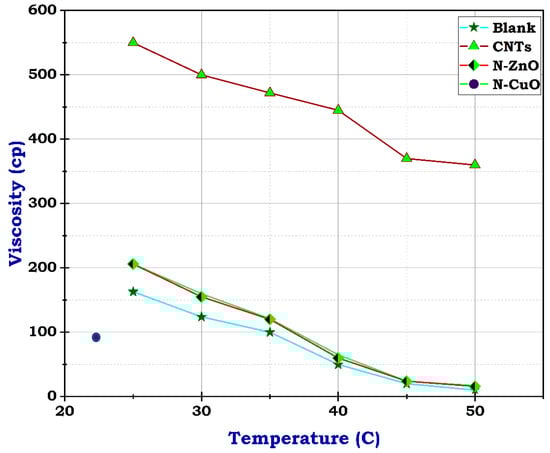 Employing nanomaterials in the oil and gas research industry has drawn tremendous interest from researchers. Khalil et al. highlighted the advancements of nanomaterials such as carbon nanotubes, metallic and metal oxide nanoparticles, and magnetic nanoparticles to improve the performance of oil and gas production processes [], especially for improving the hydraulic frac fluid rheological properties to resist the high-pressure and high-temperature conditions of reservoirs and transport the proppants along the reservoir. Tang and colleagues utilized amino-modified multi-wall carbon nanotubes (CNTs-NH2) integrated with primary polymer fluid to enhance the rheological properties of fracking fluid. The results showed enhancement in the viscoelasticity, share resistance, and temperature of the polymeric nano-solutions. Additionally, the use of CNTs-NH2 rehabilitated the wettability of the reservoir rock, leading to changes in fluid flow and distribution within the reservoir []. In another study, CNTs, nano-silica, and glass beads were employed to improve the rheological characteristics of water-based drilling fluids. This study demonstrated that using the multi-walled CNTs provided a 38% coefficient of friction reduction for drilling fluid []. Alkalbani et al. investigated the influence of N-ZnO on the water-based mud (WBM) rheological properties from surface to downhole conditions. This study revealed that utilizing N-ZnO improved the rheological properties of WBM significantly, by 40–65% []. The prepared N-CuO fluid was investigated to enhance the rheological characteristics of WBM dispersed in a solution of chia seeds [].